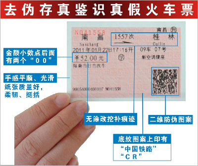 一看:稍稍转换角度就可看见真车票的底纹图案上印有“中国铁路”和“CR”(英文“中国铁路”缩语)等防伪隐形文字及字符。